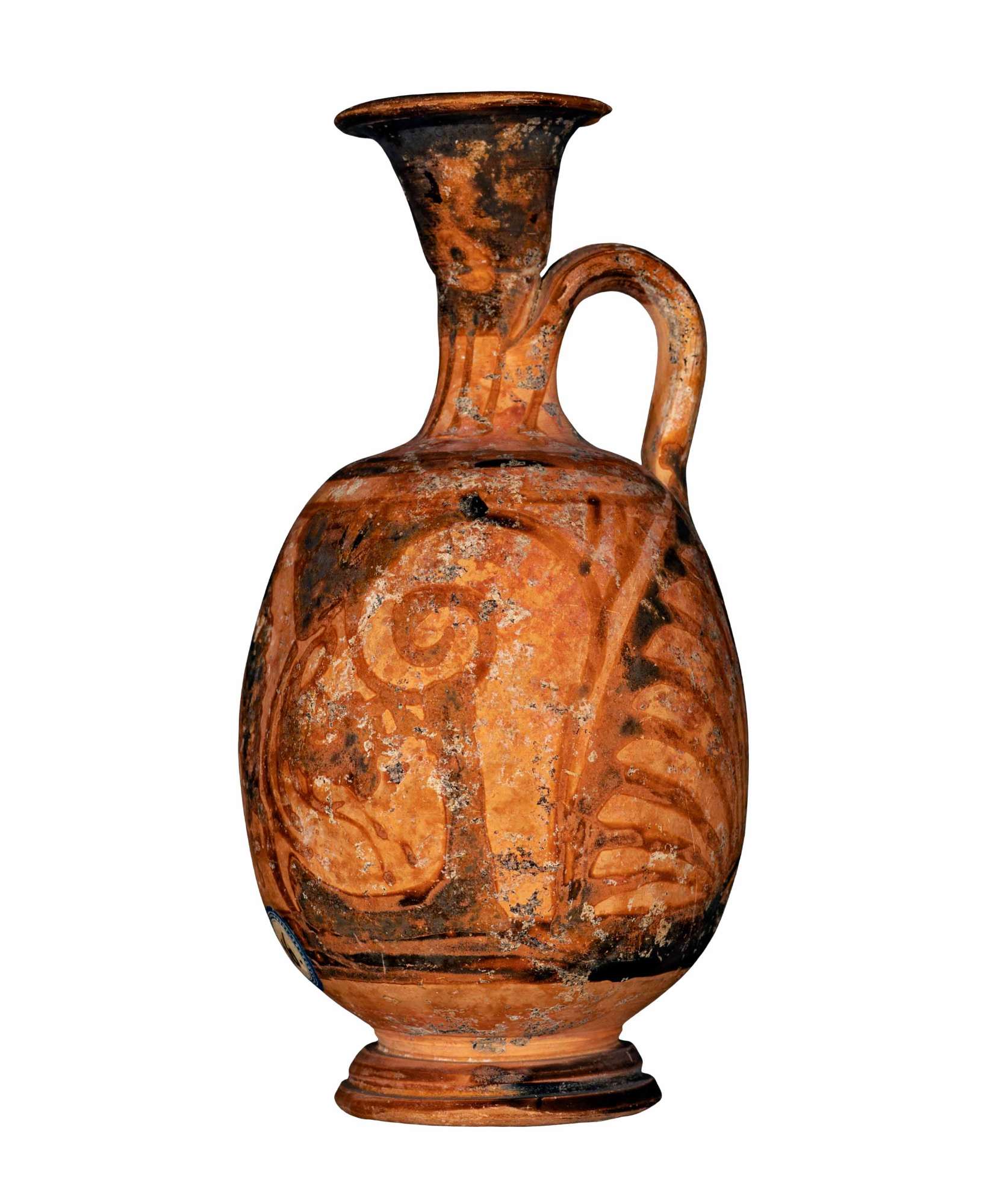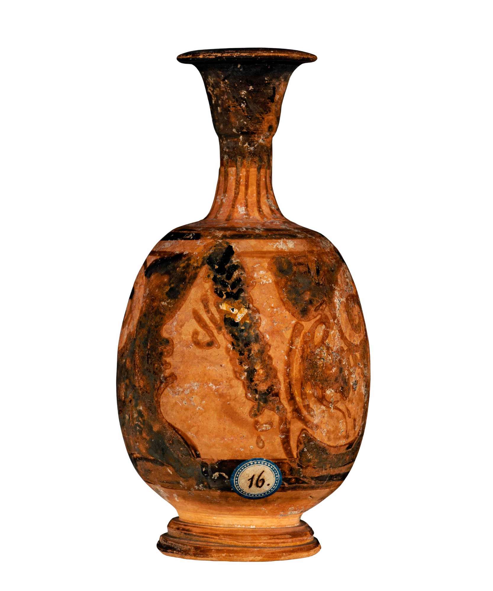 Largo bocchello svasato a profilo concavo-convesso con labbro estroflesso e arrotondato distinto dal collo da una lieve carenatura; Lato A: testa femminile di profilo con sakkòs Testa femminile di profilo, rivolta verso destra.; l’occhio è reso con dettaglio di sopracciglio, rima superiore e inferiore coincidenti esternamente e con pupilla a tratto verticali tra le due rime; il naso, con narice non caratterizzata, presenta un profilo appena concavo-convesso; labbro superiore e inferiore distinti una piccola ‘U’ rovesciata campita in nero. I capelli, visibili solo presso l’orecchio, sono acconciati e racchiusi in un sakkòs, decorato con file di punti sulla fronte e punti e linee ondulate alternate a vernice diluita sul capo. Sulla destra, ambienta la scena un elemento vegetale con coppia di foglie uncinate.