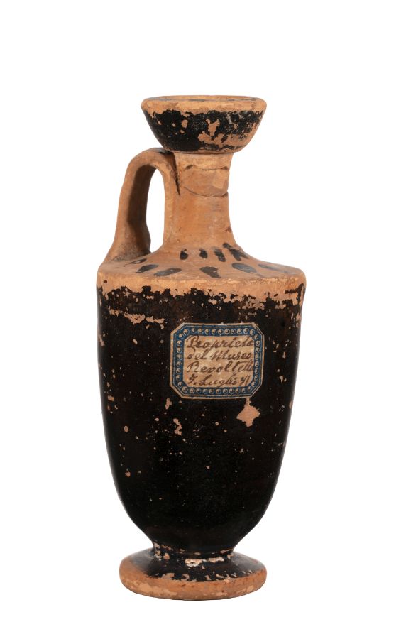 Lekytos attica a figure nere con motivo a raggiera e fiori di loto stilizzati sul collo; decorazione parzialmente abrasa.