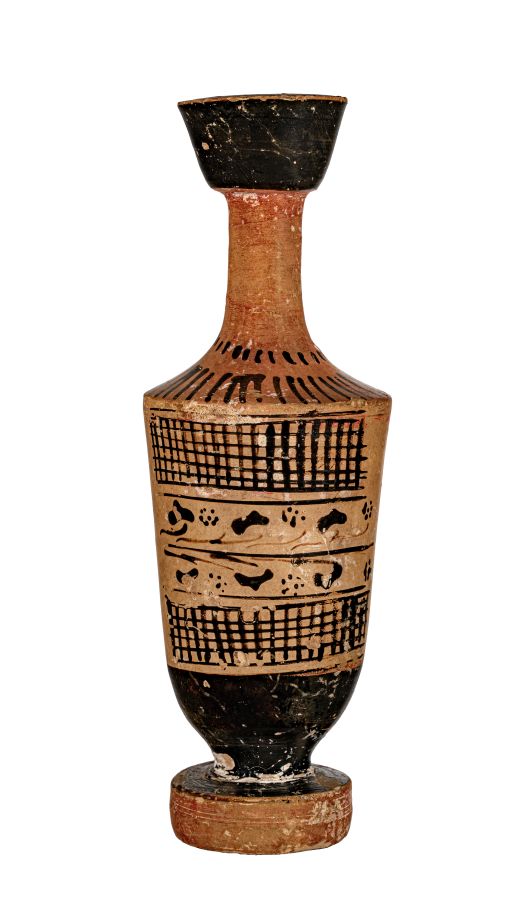 Lekytos attica a figure nere. Sul ventre decorazione a tre registri con serto d'edera tra reticoli orizzontali; sul collo motivo a linee verticali. Stelo e parte inferiore del ventre neri.