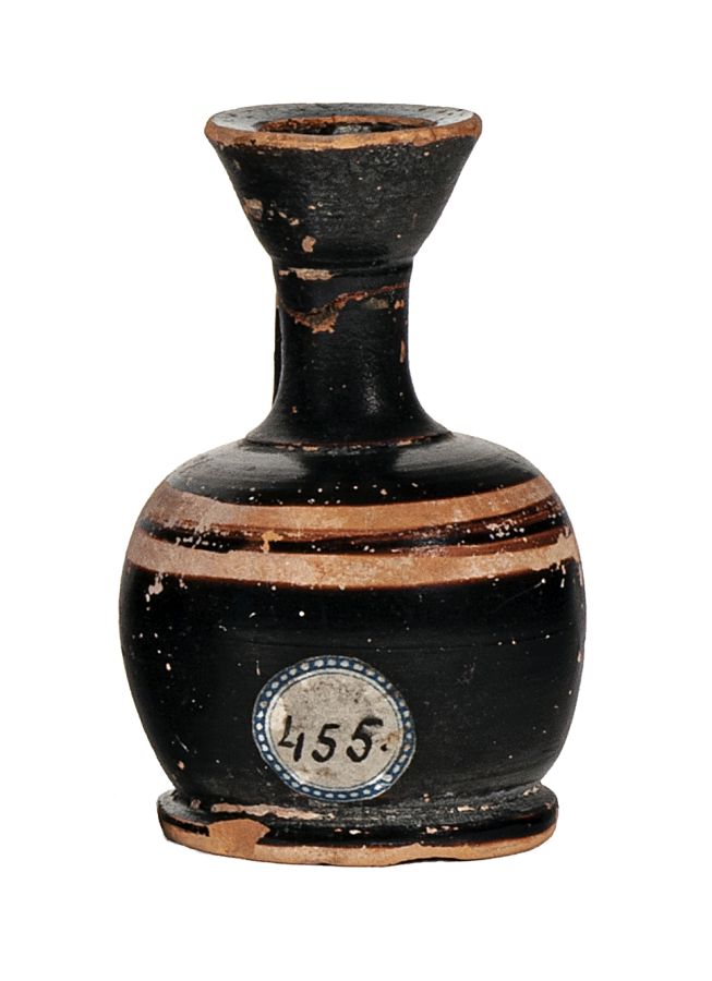 Lekythos miniaturistica a corpo globulare attica con fascia a risparmio con decorazione a linee
