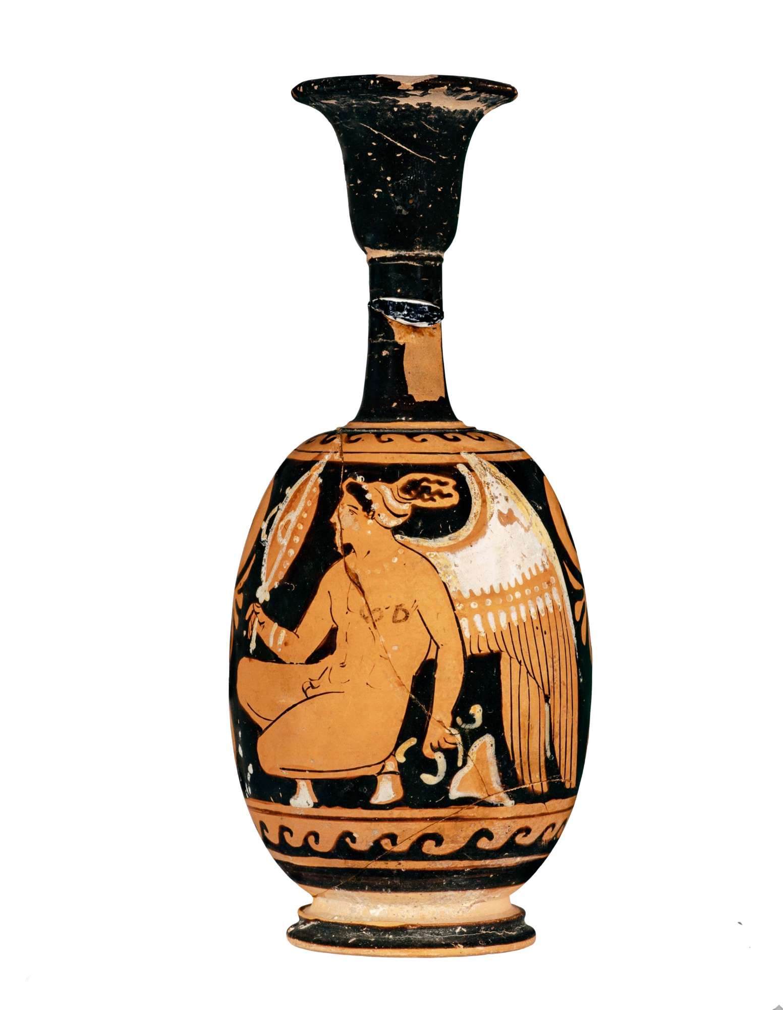 Largo bocchello distinto, svasato, a profilo concavo-convesso con labbro estroflesso. Collo affusolato, La scena è delimitata, sia superiormente che inferiormente, entro fascia a risparmio, da una sottile linea continua in nero accompagnata da un motivo ad onde correnti destrorso. Nella fascia superiore, le onde corrono capovolte, pendenti dalla modanatura al di sotto del bocchello. Lato A: erote accovacciato con tympanon e foglia Erote nudo, accovacciato, di profilo verso sinistra; regge un tympanon.Nella sinistra abbassata, tiene un ramoscello con foglia d’edera profilata in bianco. Le ali sono profilate superiormente e campite, nella parte più alta, in bianco sovradipinto, il resto del piumaggio, nella parte inferiore, è reso con file di linee a vernice nera. Sul capo, i capelli sono raccolti in una mitra, accompagnata da stephanè a bassi raggi; sempre in bianco sovradipinto anche gli orecchini pendenti a due grani, la collana a doppio filo di vaghi circolari – uno girocollo, l'altro a tracolla e ricadente sul petto –, l’armilla al polso d. e le decorazioni sulle embades. Nel campo, in basso a s., piccolo arbusto con foglie circolari in bianco (ora in gran parte evanido). Lato B: palmetta Grande palmetta a risparmio costituita da 20 foglie