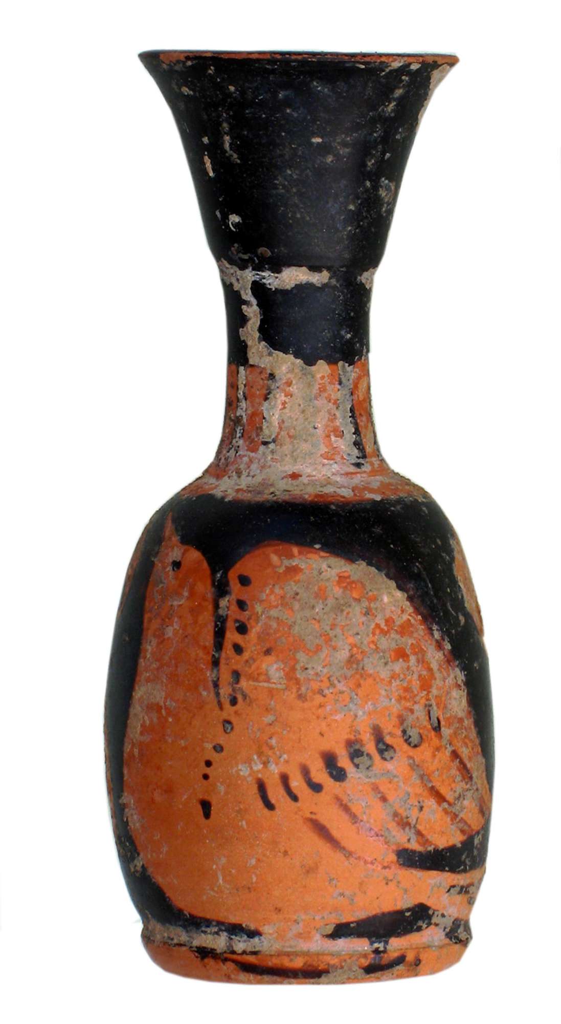 Lekythos aryballica a figure rosse con immagine di colomba tra mezze palmette.