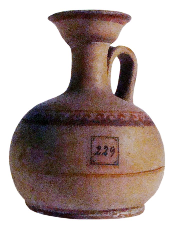 Lekythos ariballica. Bocchello troncoconico rovesciato, con collo cilindrico breve e corpo globulare schiacciato, piede ad anello, con ansa a nastro impostata verticalmente tra il collo e la spalla. Decorazione monocroma in rosso con fascia sotto l’orlo, motivo a onde in corrispondenza della spalla e fascia sottile a metà del ventre; campiti il labbro, l’ansa e il piede.