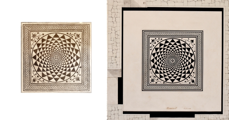 Mosaico completo rimontato dagli (otto pannelli) del mosaico della seconda fase edilizia e appartenuto al cubicolo (stanza da letto) A’, del lato orientale del peristilio, che aveva questo pavimento a mosaico bianco nero con disegno a rosone, formato da una serie di triangoli neri incurvati e restringentisi verso il centro, costituito da un fiore a quattro petali bianco su fondo nero; negli angoli sono quattro cantari (vasi), di diversa forma, da cui spuntano rami e fogliette d’edera. La cornice ha una treccia continua tra due fasce bianche delimitate da linee nere. Il riquadro era inserito in una larga fascia bianca con bordo nero alle pareti.