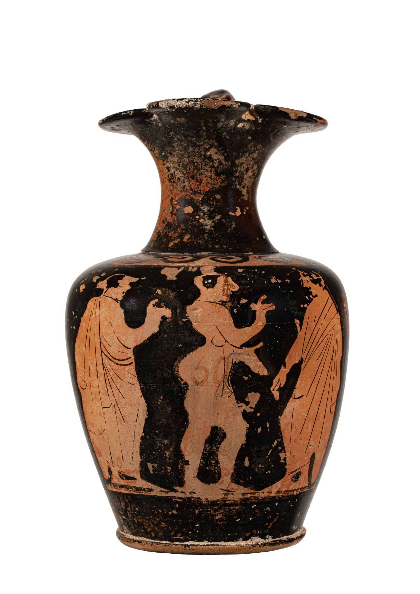 Oinochoe attica a figure rosse con uomo e due giovani a colloquio