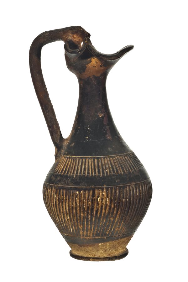 Oinochoe a vernice nera, tendente al rosso, sovraddipinture in rosso. Labbro modanato, orlo trilobato e estroflesso, stretto collo a profilo concavo, corpo globulare espanso particolarmente rastremato alle estremità, strigilato con fascia liscia tra le strigilature, ansa a bastoncello verticale leggermente sormontante e terminante a protome leonina, basso piede ad anello. Decorazione completamente evanida.