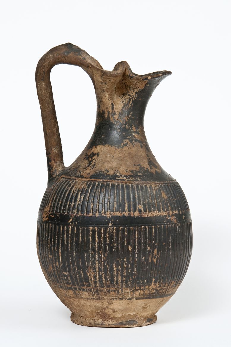 Oinochoe a vernice nera con sovraddipinture in rosso amaranto. Labbro modanato, orlo trilobato ed estroflesso, collo a profilo concavo, corpo globulare espanso strigilato con rettangolo e fascia liscia tra le strigilature, ansa a nastro desinente alla sommità, nel punto d’attacco all’orlo, in una protome, basso piede ad anello. Una linea in rosso amaranto inquadra superiormente il corpo strigilato, campendo la linea incisa sottostante. Una coppia di linee dipinte sempre in rosso inquadrano la fascia liscia tra le strigilature.