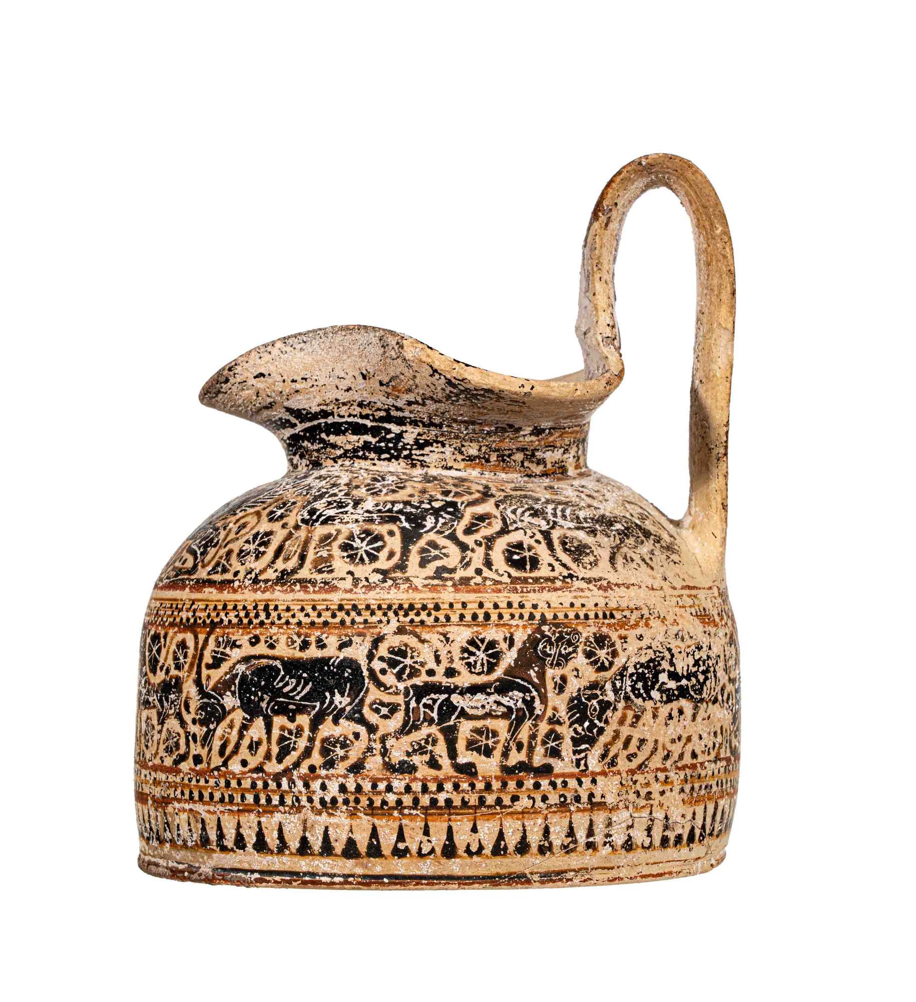 Oinochoe corinzia a bocca trilobata a ventre troncato da base piatta; ansa sopraelevata; decorata da teorie sovrapposte di grifi, uccelli pantera e capro, graffiti e dipinti.