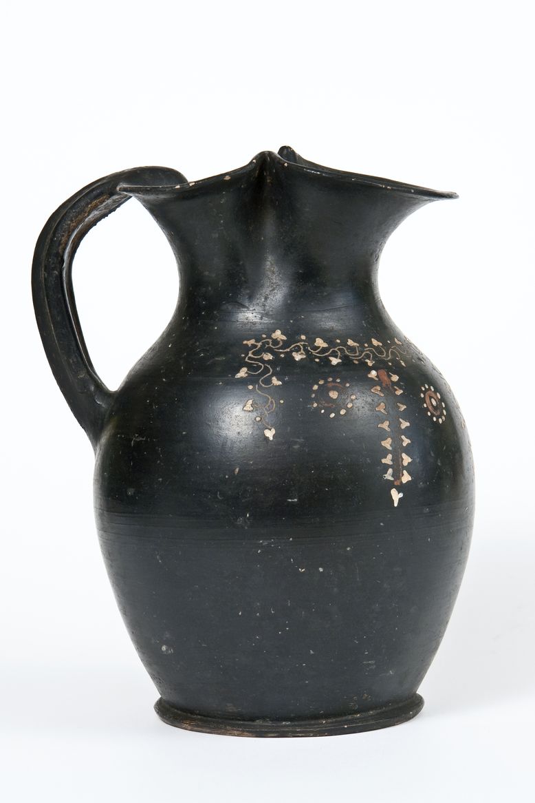 Oinochoe a vernice nera lucente con sovraddipinture in bianco, giallo e rosso/arancio ed incisioni. Orlo trilobato ed estroflesso, basso collo a profilo concavo, corpo ovoidale, ansa a nastro verticale desinente dalla sommità, nel punto d’attacco all’orlo, in una protuberanza, stilizzazione di una protome, basso piede ad anello. Sul corpo: tralcio d’edera a pergolato, con stelo sinuoso inciso e punti, da cui pendono due tralci d’edera verticali con stelo lineare dipinto in rosso amaranto e foglie cuoriformi in giallo su base bianca. Tra i tralci di edera verticali rosette di punti con bottone centrale in giallo inscritto in un cerchio rosso amaranto.