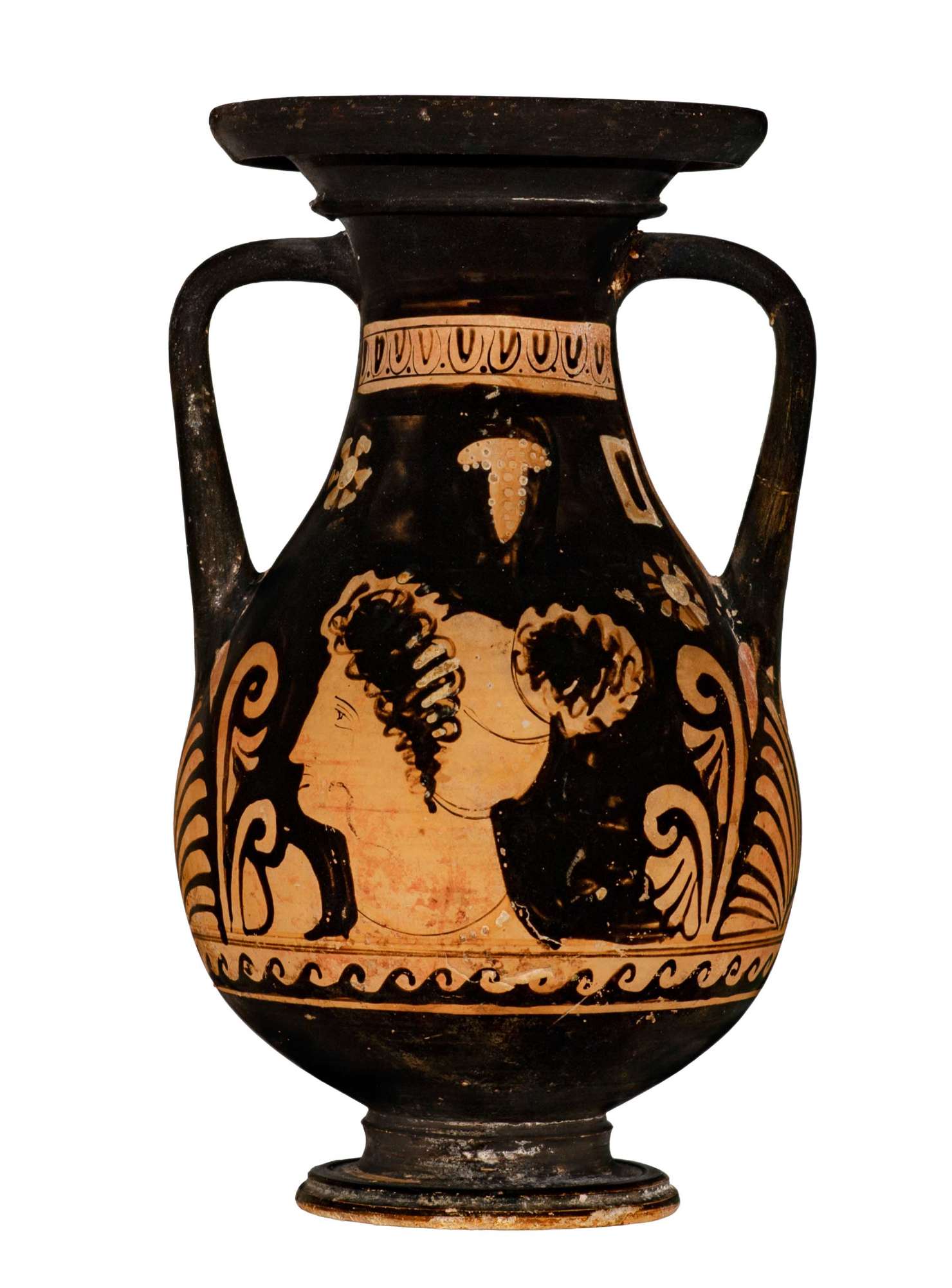 Orlo revoluto a profilo convesso con labbro estroflesso su base modanata con profilo angolato; spalla leggermente obliqua. Al di sotto delle scene figurate, entro fascia risparmiata corrente per tutta la circonferenza del vaso, decorazione a onde correnti destrorse campite a vernice nera. Anse e interno verniciato. Lato A: figura femminile seduta su roccia con tirso e cista Figura femminile di tre quarti con testa di profilo rivolta verso destra seduta su sedile roccioso sovradipinto in bianco; indossa un lungo chitone smanicato, ripreso in vita e decorato lungo l’orlo inferiore da una fila di puntini in corrispondenza delle pieghe del tessuto; le linee della gamba d. rimangono visibili attraverso la veste, mentre della s. si percepiscono solo i volumi al di sotto del chitone. I capelli sono raccolti in una mitra, che lascia fuoriuscire ricce ciocche su nuca e fronte. Arricchiscono la figura orecchini pendenti, due bracciali sovradipinti e una collana con filo in vernice nera e vaghi pendenti sovradipinti in bianco. I piedi sembrano calzati, per la presenza di sovraddipinture in bianco e giallo. Il braccio sinistro., flesso, regge cesta con coperchio, con sovraddipinture in bianco o giallo ormai evanide: i bordi superiore e inferiore evidenziati da una linea continua; la decorazione è costruita su due registri suddivisi da una doppia linea continua centrale; la decorazione del registro superiore è costituita a una serie di onde correnti; quella inferiore da una linea continua ondulata. La mano destra, posata sulla seduta, stringe tra le dita il bastone del tirso, che si appoggia anche al gomito. Il coronamento del tirso è costituito da 4 coppie di foglie e una foglia singola al vertice superiore. Nel campo in alto, subito al di sotto della fascia risparmiata con decorazioni ovulo-guscio-punto, fila di palline sovradipinte, che partono in corrispondenza della testa della figura femminile fino all’ansa d. Poco sotto, sulla s., rosetta quadripetala con profili e bottone centrale sovradipinto; a destra benda appesa con sovraddipinture in bianco (ormai del tutto evanide). Lato B: testa femminile con stephanè Testa femminile di profilo rivolta verso sinistra Fronte e naso costituiti da un’unica linea continua appena bombata all’attacco tra fronte e naso; occhio con dettaglio di palpebra superiore e inferiore non chiusi, rima superiore, pupilla e sopracciglio ben definiti. Breve tratto segna inferiormente la narice. Probabili sbaffi di vernice su mento e tra zigomo e collo della figura. I capelli sono raccolti in una mitra, bordato alle estremità da una doppia linea in vernice diluita, cui è sovrapposta una stephanè ad alti raggi in giallo sovradipinto indossa collana con filo continuo a vernice nera da cui pende una serie di vaghi circolari sovradipinti in bianco . Nel campo, in alto, tre elementi isolati: una rosetta a sei petali con profili e bottone centrale sovradipinti in bianco, un grappolo d’uva risparmiato con acini circolari in bianco sovradipinto e una finestra strombata profilata in bianco. Poco sotto, sulla destra., ulteriore rosetta a otto petali profilati e bottone centrale sovradipinto.