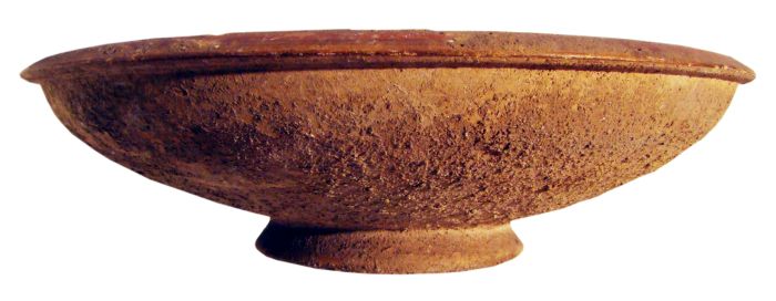 Patera con vasca bassa e ampia, a profilo convesso. Labbro obliquo, piede troncoconico. Decorazione in vernice bruna: dipinto l’orlo con motivo a fasce concentriche nere e brune assai sbiadite e coperte da incrostazioni.