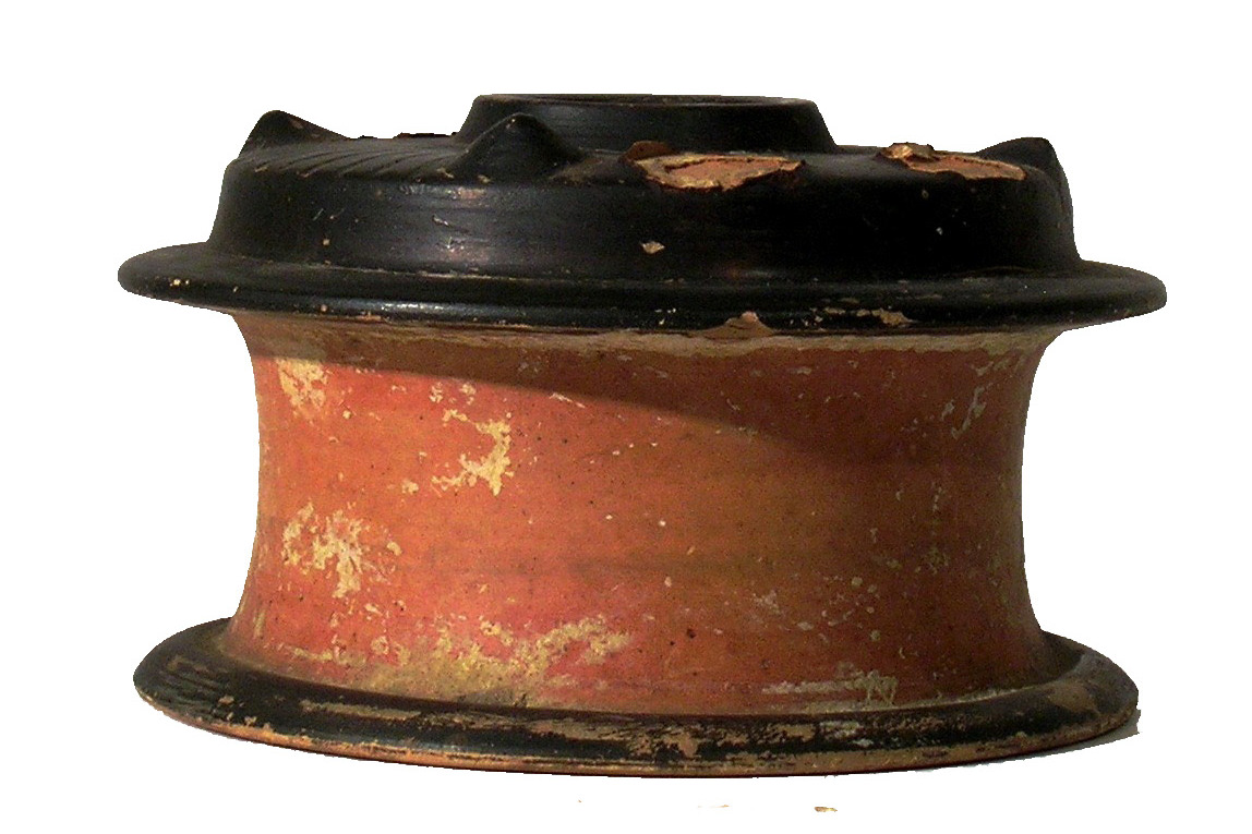 Pisside a vernice nera (ventre rosso) di forma circolare piatta con due alte anse riattaccate e 4 bugne, piede sporgente come la spalla