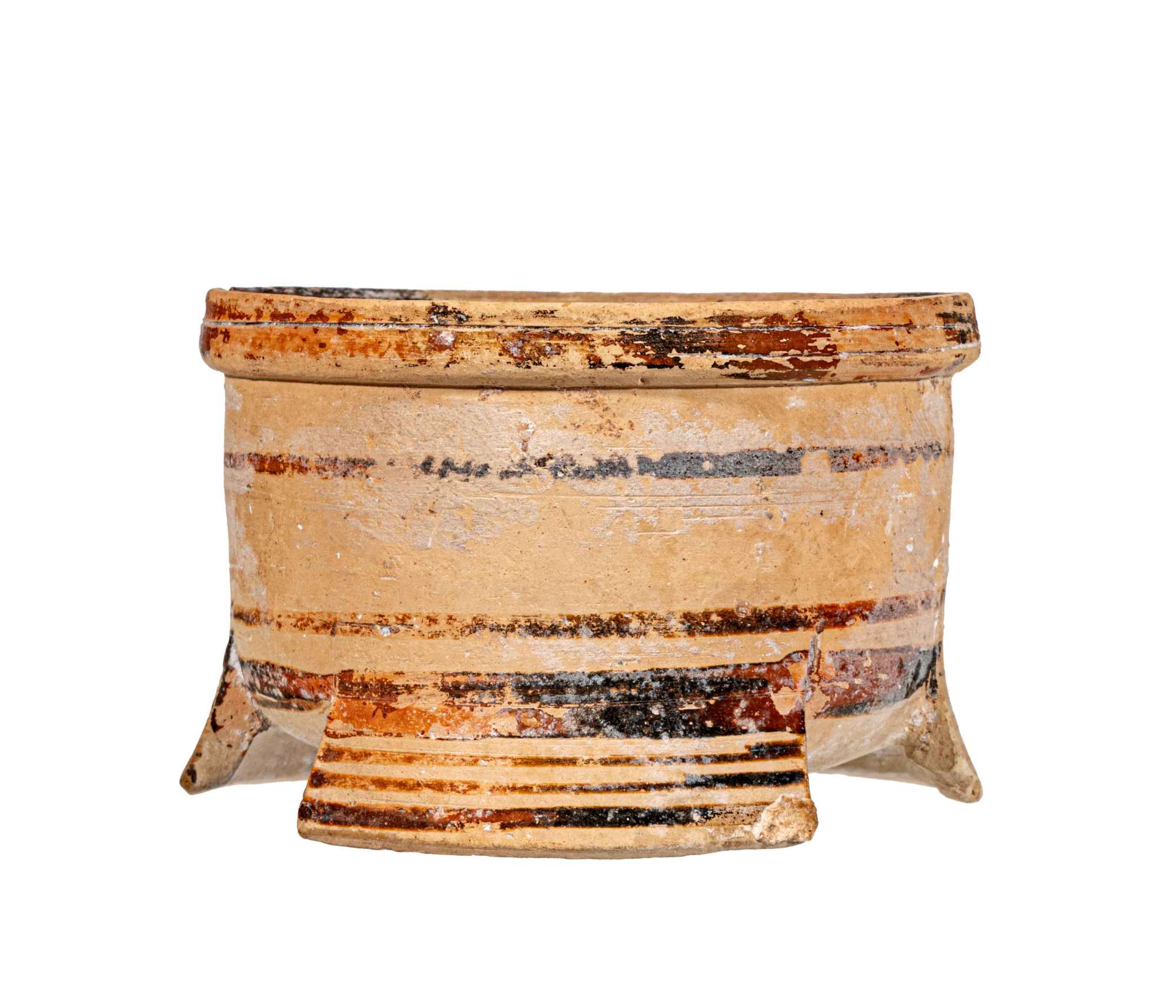 Pisside cilindrica tripode corinzia a fasce, priva del coperchio.