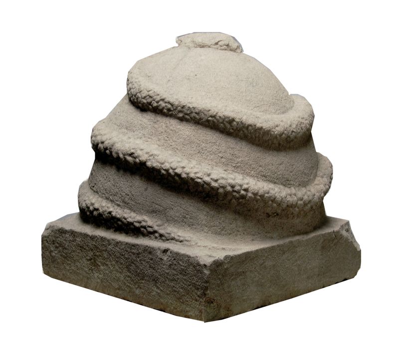 L'onfalo, a forma di uovo con serpente squamato avvinghiato, è vuoto internamente e poggia su uno zoccolo liscio parallelepipedo.