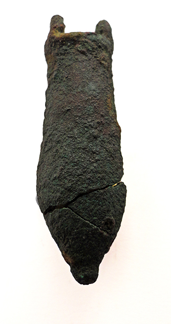 Versione miniaturistica di una situla, recipiente che veniva usato durante i rituali per versare acqua lustrale. La forma è quella classica, allungata, con la base appuntita e le due piccole anse che si dipartono verticalmente dal bordo. A causa della corrosione non si distingue se la superficie fosse decorata; la situla è ricomposta da diversi frammenti. Si può pensare che risalga all'Epoca Tarda (715-332 a.C.).