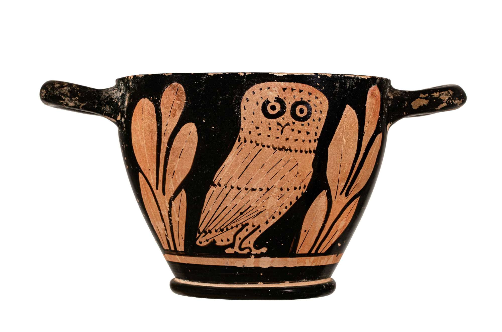 Skyphos glaux attico a figure rosse. Lato A e B: civetta tra alloro o olivo.