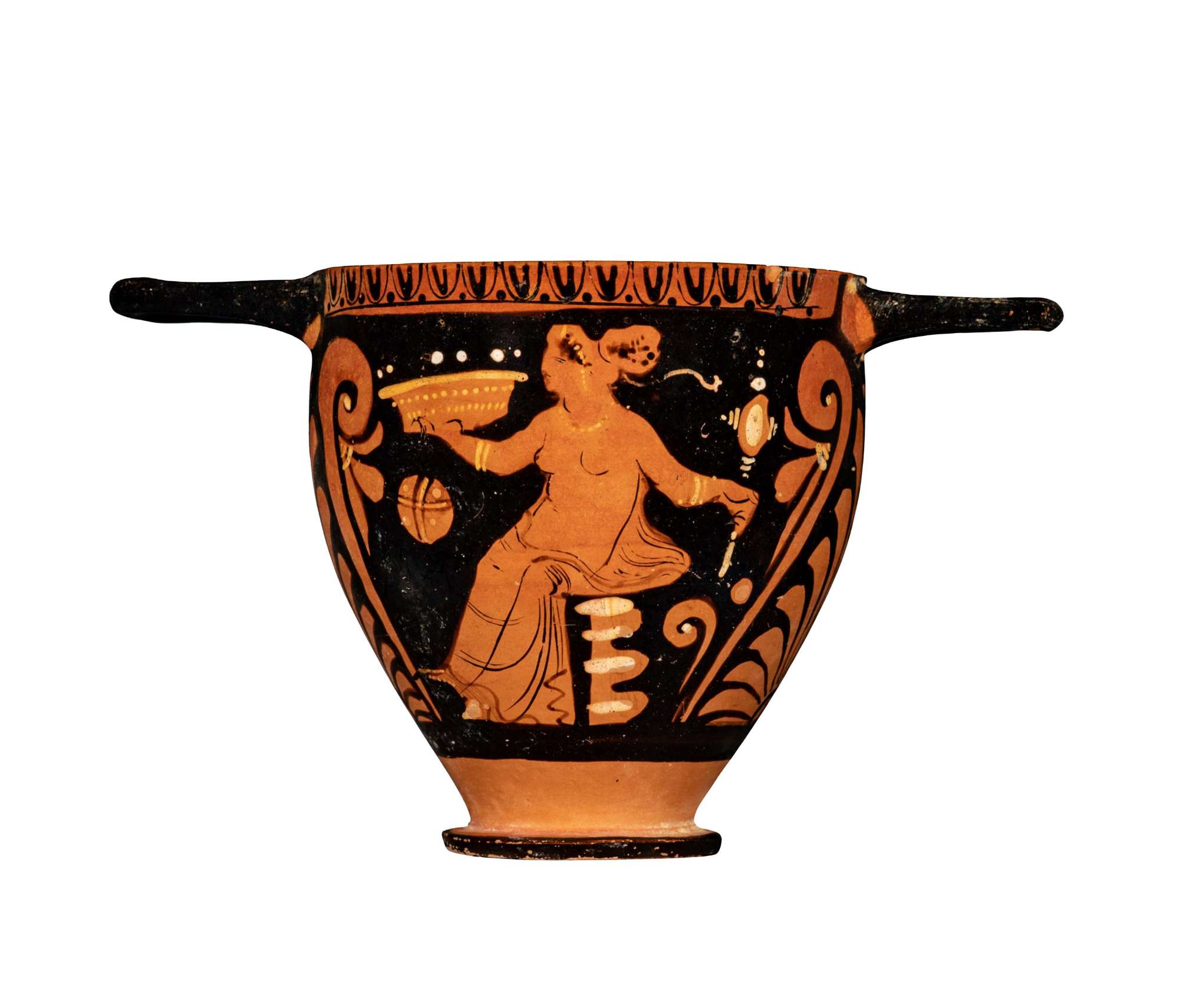 Skyphos apulo a figure rosse, dettagli bianchi; palmette sotto le anse. Lato A: donna seminuda seduta con specchio e bacile con offerte e palla a spicchi. Lato B: testa femminile con mitella.