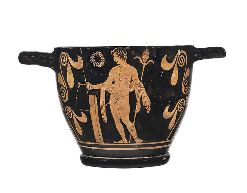Argilla rosata (7.5 YR 7/4 Munsell); vernice lucente, di buona qualità, ben conservata ma scalfita e diluita in alcuni punti. Si rilevano, inoltre, alcune piccole zone che evidenziano problemi di cottura. Il vaso presenta un corpo di forma troncoconica dal profilo leggermente convesso, che poggia su un piede ad anello con profilo troncoconico rovesciato. Le anse a bastoncello sono impostate orizzontalmente poco sotto l' orlo. Decorazione del lato A: protagonista della scena è una menade ritratta di profilo che corre verso destra, mentre con la mano destra tiene un tirso e con la sinistra una patera. Porta i capelli raccolti sulla nuca e racchiusi da una doppia fascia che lascia fuggire un solo riccio; è vestita con un lungo chitone ricco di drappeggi, caratterizzato da una sottile banda scura che ne delinea alcuni contorni. Più a destra, a completare la scena, è raffigurato anche un pilastrino antistante la menade stessa. Decorazione del lato B: è rappresentato un giovane efebo nudo, stante, con testa di profilo e corpo di tre quarti. Esso porta sul capo una corona d'alloro tra i capelli, che scendono in ricche ciocche sul collo; oltre ai semplici calzari ai piedi, indossa soltanto uno scialle che, poggiando sugli avambracci, ricade dietro la schiena. Il giovane tiene nella mano destra uno strigile, mentre con la sinistra regge un tirso. Il suo baricentro è spostato verso sinistra, con il peso che poggia sulla sola gamba destra mentre la sinistra è leggermente piegata, a riposo. Come sul lato A, ma questa volta a sinistra, completa la scena un pilastrino, antistante l'efebo stesso, con una corona d'alloro al di sopra, come appesa allo sfondo. La decorazione accessoria è costituita, sotto le scene figurate, da un doppio filetto risparmiato, che corre lungo tutto il perimetro del vaso. Lo spazio sotto le anse è arricchito da due palmette tra girali fogliati e fioriti. Un sottile filetto graffito decora il punto di stacco tra ventre e piede.