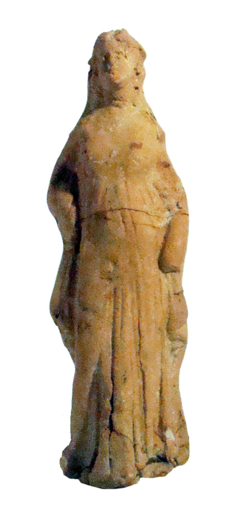 Figurina in terracotta, realizzata a matrice. Cava. Sul retro in rosso "5089" e "655". Figurina femminile stante, con la gamba destra piegata in avanti. Testa piccola su collo lungo. Capelli ondulati con due ciocce ricce che cadono ai lati del collo. Indossa una veste a piegoline, cinta sotto il seno. Raccoglie un lembo del mantello sul fianco destro con la mano.