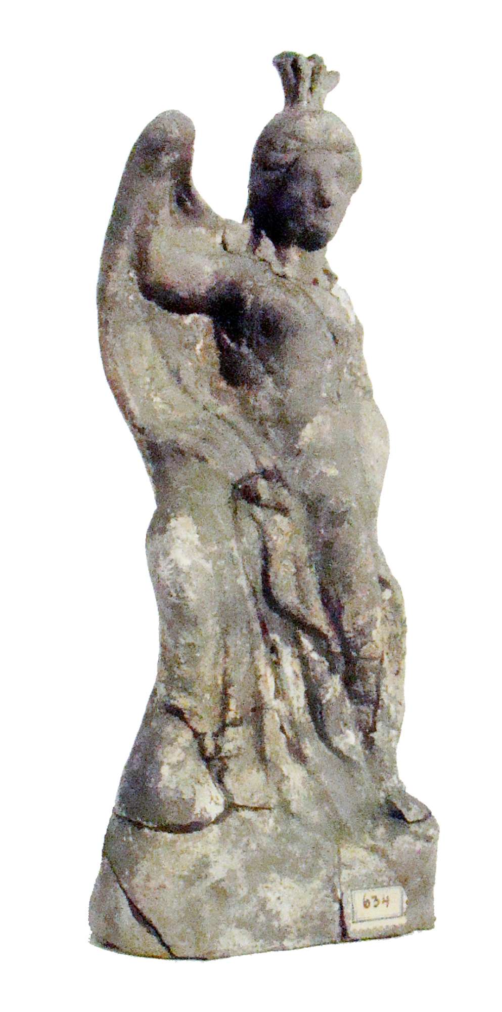 Figurina femminile in terracotta, di colore cinerognolo, realizzata a matrice. Cava. Cavità rettangolare sul retro. Etichetta sulla base ovoidale, sul retro è riportata la dicitura "28 febbraio Baldini GRECIA" e vicino, in rosso, "634, 5090". All'interno è presente la cifra "634". Un'etichetta ripropone la cifra "634". Figura di donna galata con gamba destra su globo, braccio destro sollevato. Alto cimiero e riccioli ricadenti lungo il collo. Indossa una veste a fitte piegoline ed un ampio mantello che passa a tracolla sul petto e avvolge il braccio sinistro.
