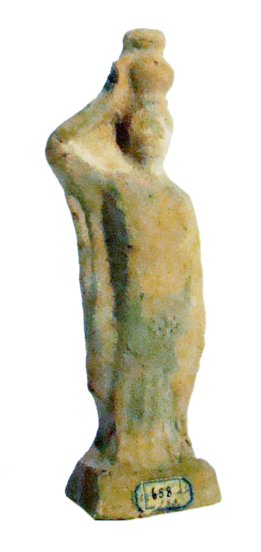Figurina in terracotta, realizzata a matrice. Retro non lavorato, con piccolo foro circolare. Leggibile il numero a matita sbiadito "5092" e le cifre in rosso "658" e "5092". Apposta un'etichetta con la cifra "658". Figurina femminile stante, con gamba sinistra avanzata e piegata, su un piedistallo di quadrangolare. Sorregge con il braccio destro un vaso sulla testa. Il braccio sinistro è disteso lungo il fianco. Non riconoscibili altri particolari.
