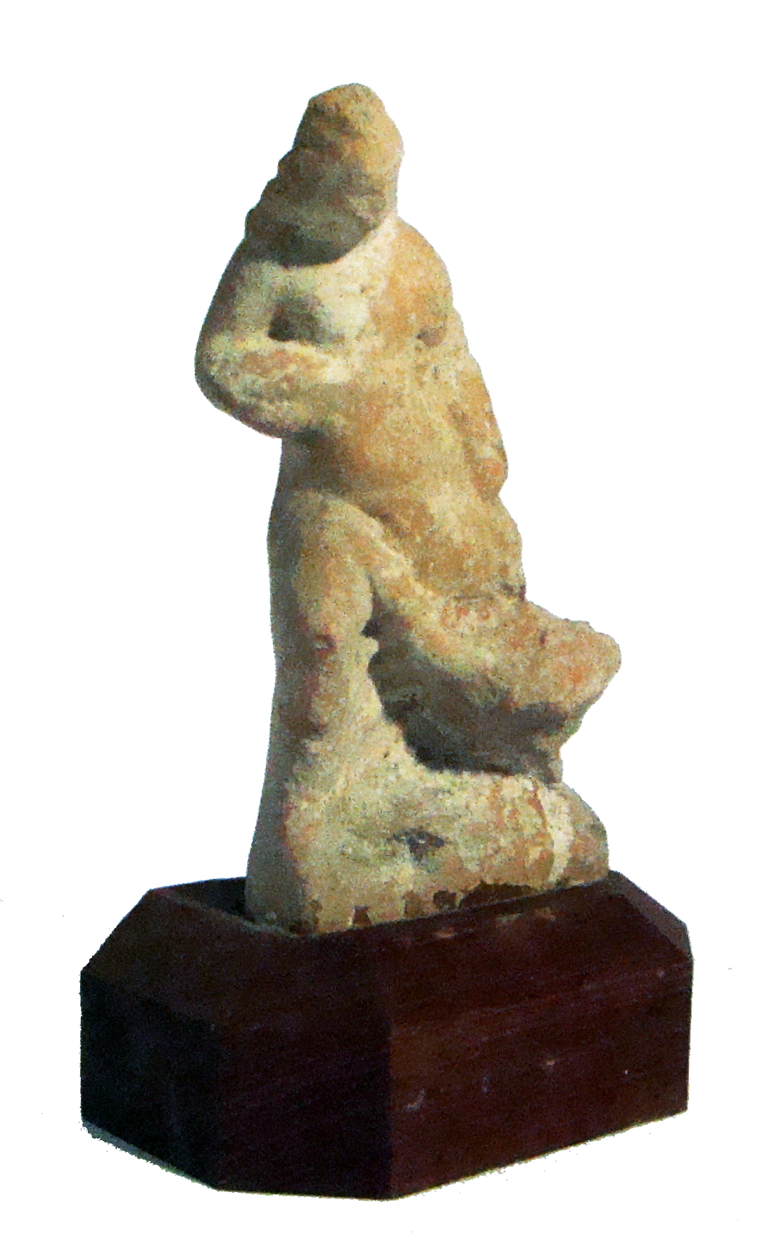 Statuina in terracotta, realizzata a matrice, alloggiata su una basetta lignea moderna. Retro non lavorato. Riporta sul retro l'etichetta "Cyme 2 marzo 1889"; sul dorso e sulla basetta lignea è presenta la scritta in rosso "5113". Figura apollinea dalle sembianze giovanili, nuda panneggiata sulle gambe, gradiente e con il peso sulla gamba destra. I capelli ricadono lungo le spalle, volto poco leggibile. Ai piedi è rappresentato un cigno.