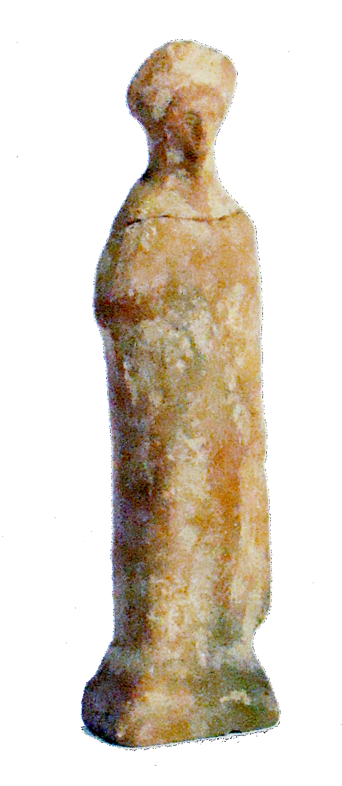 Statuina di tipo arcaico di una donna. La figura col volto piccolo indossa una pesante tunica e copricapo.
