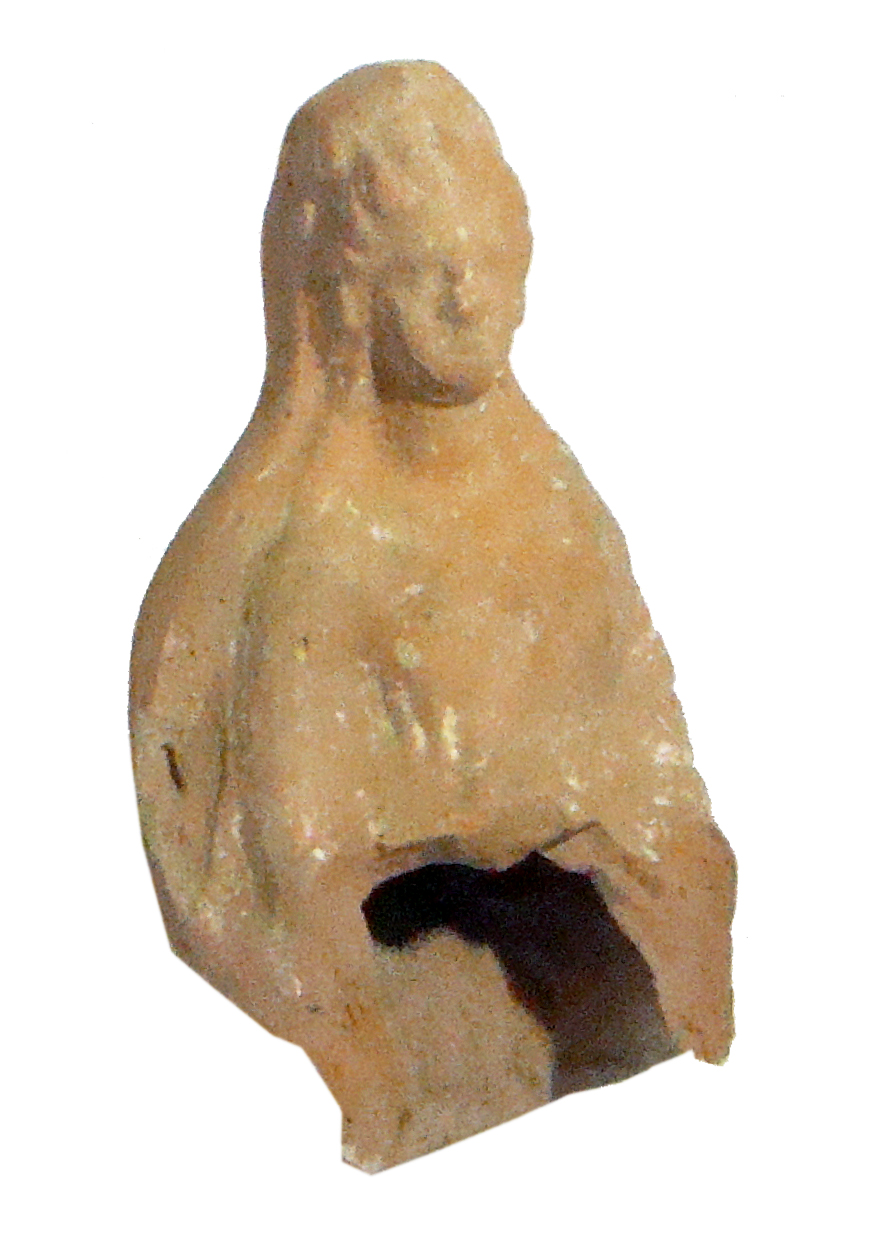 Statuetta fittile realizzata a matrice, spezzata all'altezza del ventre. Retro non lavorato. Visibile la cifra "357" in colore nero ed etichetta che reca la dicitura "Rud---". Basetta lignea moderna non pertinente con etichetta "889". Figurina femminile, leggermente curva in avanti. Velata, con diadema lunato e mantello che scende sulle spalle. Riccioli lungo il collo.