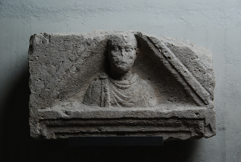 Parte superiore di stele rettangolare nel quale è realizzato a sottosquadro un frontone modanato in cui è il busto di un uomo che indossa tunica e mantello, fissato alla spalla con una fibula rotonda.