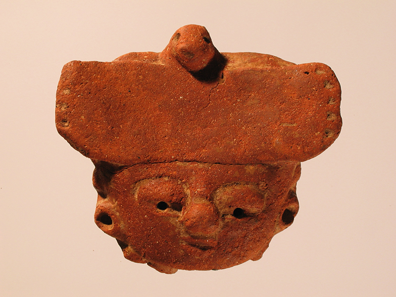 Testina di stile Usulután piena, modellata a mano con impasto di argilla rossa. Ritrae il volto di un personaggio di alto rango, come segnalano i ricchi ornamenti e la fronte appiattita dalla deformazione cranica. Occhi e bocca, del tipo a chicco di caffè, sono in rilievo. L’iride è reso con un foro. I lobi sono abbelliti da orejeras circolari; sotto al collo sono visibili due grosse perle ovali che componevano la collana; il naso, molto sporgente, termina con una protuberanza a doppia voluta che probabilmente rappresenta un ornamento nasale. La fronte è dominata da un importante copricapo che rappresenta un uccello con le ali aperte, un aquila o un avvoltoio. È composto da un elemento rettangolare sormontato, al centro, da una testina in rilievo. I tratti dell’animale sono resi in maniera sommaria; alcune scanalature praticate lungo i bordi, ai due lati del rettangolo, rendono le piume. Sono visibili, specie sul volto, tracce di pittura bianca.