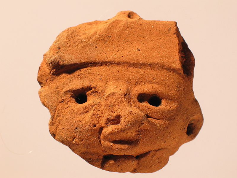 Esemplare di testina fittile di stile Usulután con le fattezze di un uomo ingioiellato. Malgrado l’oggetto sia privo di alcuni frammenti, gli ornamenti sono facilmente individuabili: orecchini circolari resi da un ampio foro sui lobi, una vistosa collana composta da pastiglie ovali applicate immediatamente sotto al mento, un ornamento nasale, in parte mutilo, pendente dalle narici. Il copricapo, composto da due elementi rettangolari, posti uno sul davanti e l’altro sul retro della testa, era arricchito da applicazioni in rilevo; tra queste, al centro, spiccava una testa zoomorfa.