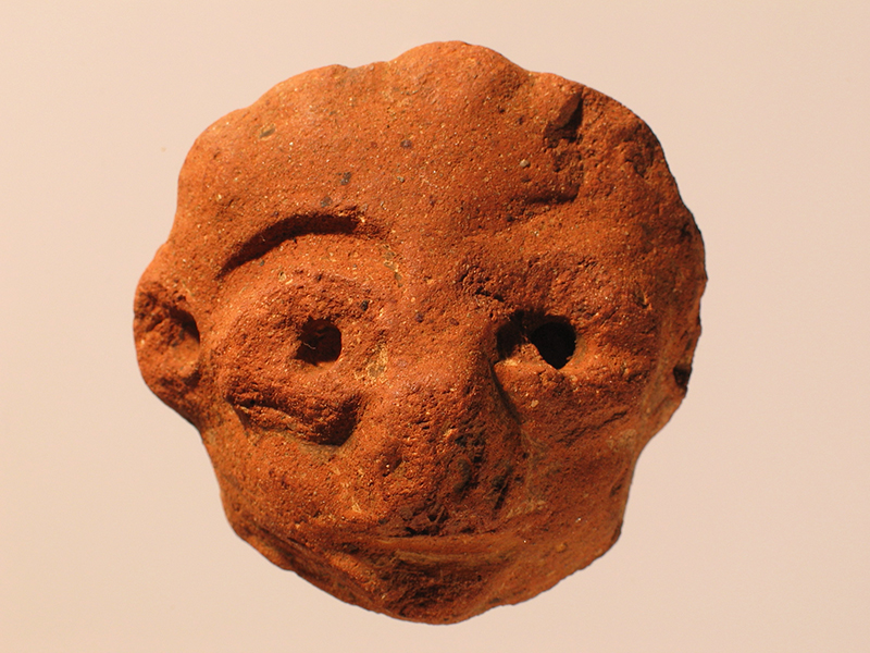 Piccola testa umana di stile Usulután modellata in argilla piena di colore rosso. L’interpretazione dei tratti del volto è piuttosto grossolana. Il viso appare prominente. Alcune parti in rilevo, come il contorno degli occhi e il naso, sono spezzati. Gli occhi sono individuati da due fori e anche l’arcata sopracciliare risulta ben resa. La parte posteriore della testa non è piatta ma rivela una sporgenza con delle scanalature. Sulla superficie restano tracce di pittura bianca.