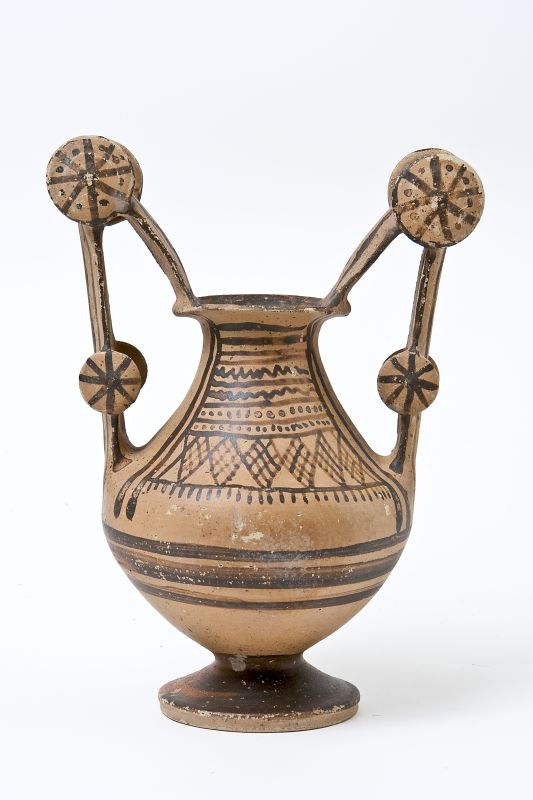 Trozzella in ceramica messapica. Orlo estroflesso, alto collo troncoconico, a profilo convesso, corpo allungato a profilo ovoidale, con anse verticali sormontanti, impostate sull’orlo e sulla spalla, provviste di doppia coppia di dischi (“trozze”), di cui quelli superiori sono di dimensioni maggiori; alto piede troncoconico e spalla distinta. Decorazione monocroma in bruno-nerastro, con piede e interno dell’orlo dipinti in bruno-nerastro; risparmiata la costa laterale del piede. Sul collo e sulla spalla, motivi geometrici disposti in registri, a partire dall’alto: gruppo di linee orizzontali diritte, fila di ovoli, tremolo, una serie di losanghe reticolate e una collana a corti pendenti; nella parte inferiore del corpo, fasce parallele; sull’orlo, tratti; sulle anse, linee verticali; sui dischi, linee radiali, alternate a punti solo su quelle superiori.