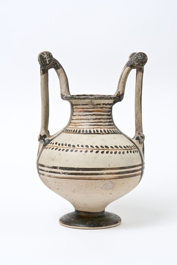 Trozzella in ceramica messapica. Orlo estroflesso, alto collo troncoconico, a profilo lievemente concavo, corpo allungato a profilo ovoidale, con anse verticali sormontanti, impostate sull’orlo e sulla spalla, provviste di doppia coppia di dischi (“trozze”), di cui quelli superiori sono di dimensioni maggiori; alto piede troncoconico e spalla distinta. Decorazione monocroma in bruno-nerastro, con piede e interno dell’orlo dipinti in nero-brunastro; risparmiata la costa esterna del piede; sulla spalla, una serie di pannelli definiti da linee parallele, in cui su un lato campeggiano palmette isolate ai lati e una rosetta al centro, mentre sull’altro un ramo di ulivo. Nella parte inferiore del corpo, fasce parallele; sull’orlo e sulle anse, tratti; dischi superiori dipinti, sui dischi inferiori linee incrociate.