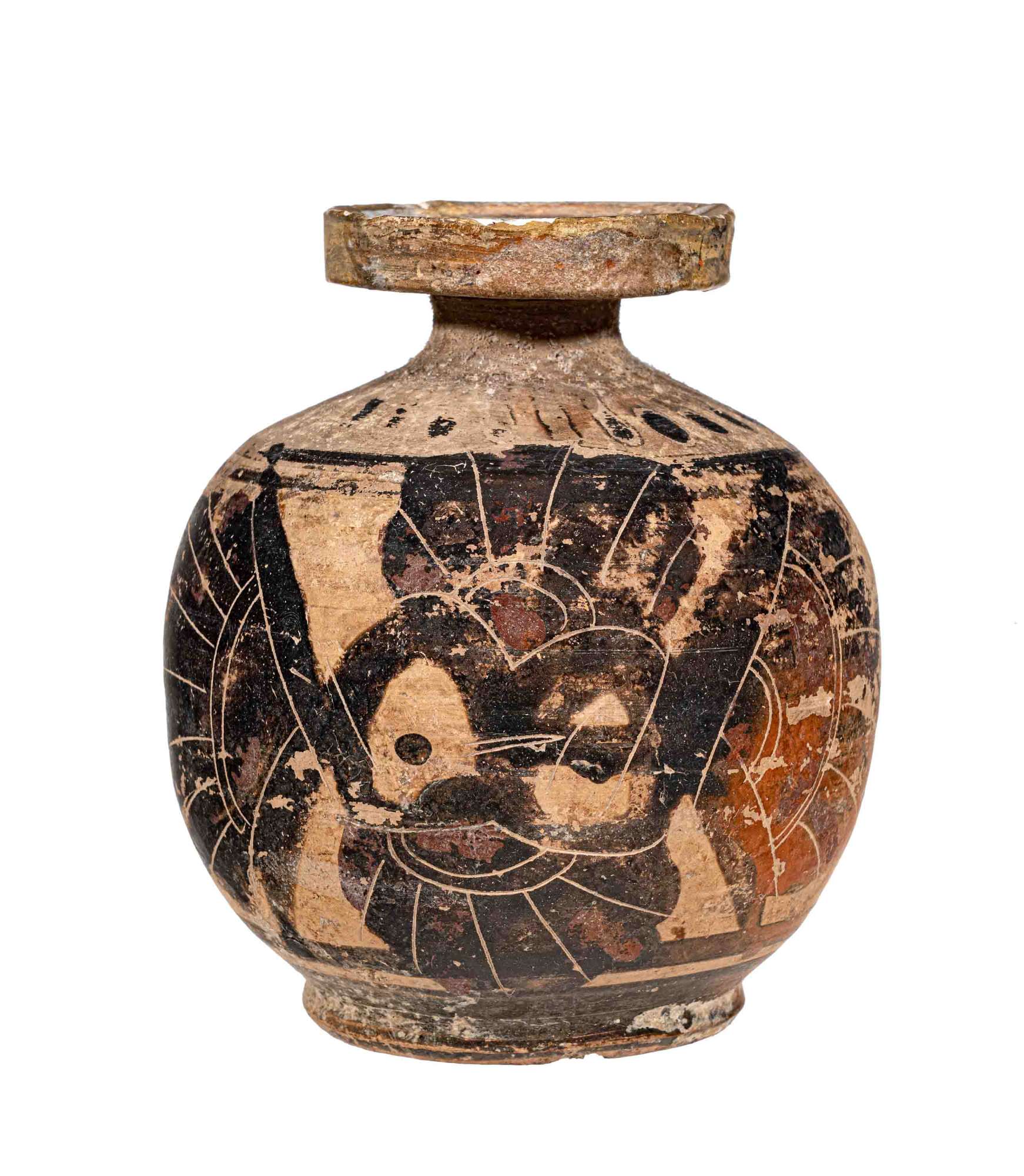 Grande aryballos corinzio con uccello visto frontalmente con le ali spiegate (civetta?) e altro uccello (gallo) in atto di camminare.