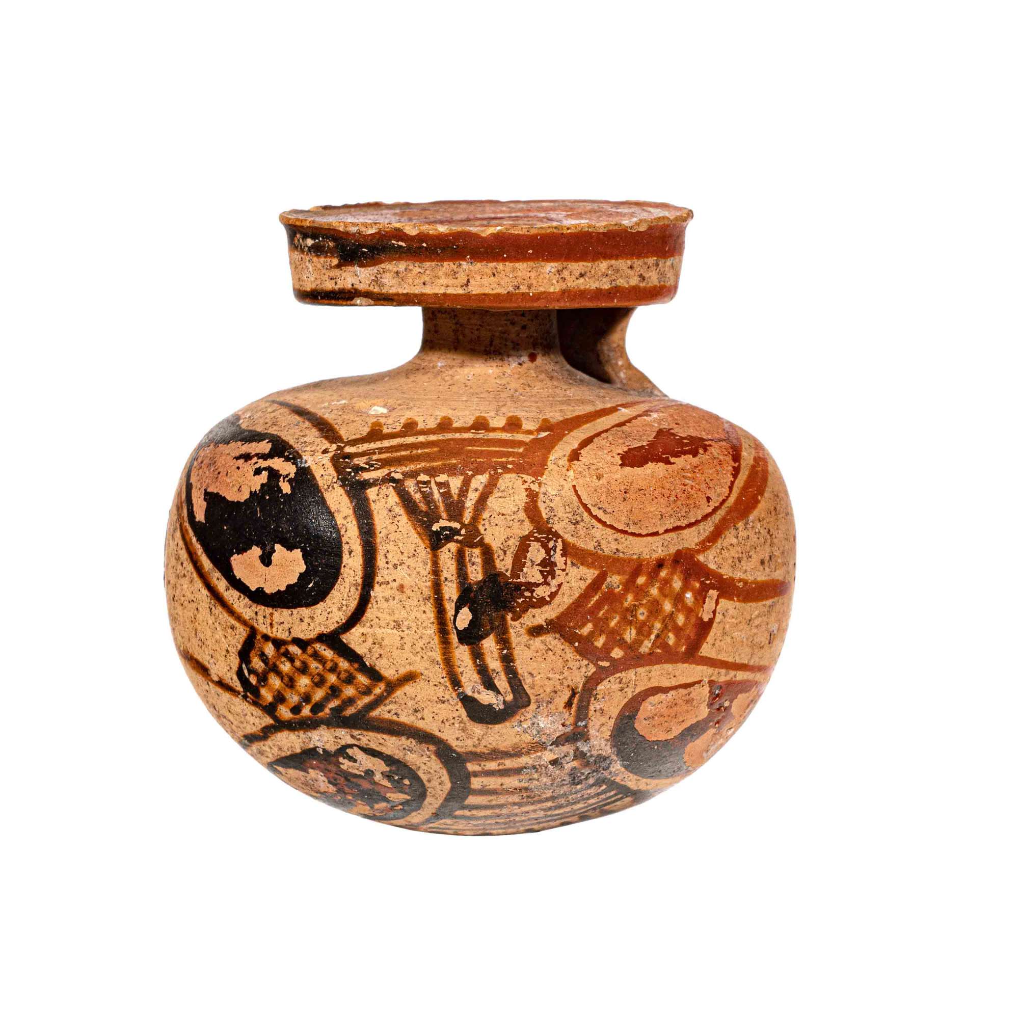 Aryballos corinzio con quattro petali contrapposti nascenti da un germoglio verticale di loto, separati da zone a reticolo.