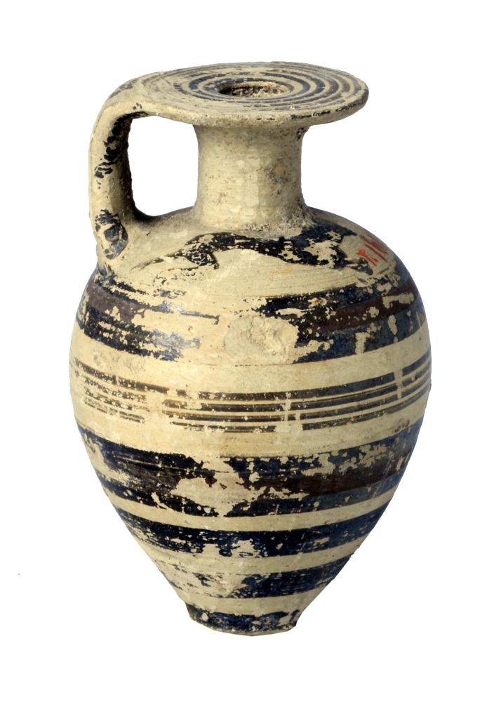 Aryballos piriforme rastremato verso il puntale etrusco-corinzio a fasce con due animali correnti sotto il collo.