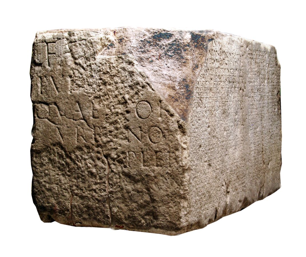 Blocco liscio; Fronte iscritta; Lato destro iscritto; Precedentemente integrato da base e coronamento non pertinenti, ora rimossi; Sulla faccia principale è scolpita la dedica, su una di quelle laterali il decreto municipale relativo all'onorificenza tributata al senatore.