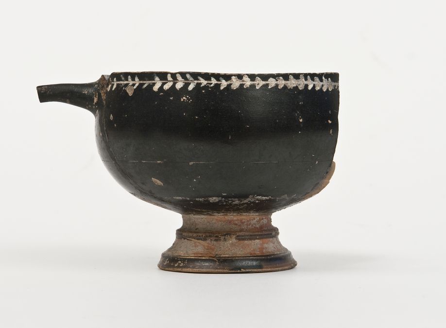 Coppa su piede a vernice nera lucente con sovraddipinture in bianco, giallo, rosso ed incisioni. Ricomposta parte della vasca. Orlo leggermente estroflesso, vasca emisferica, anse a bastoncello impostate orizzontalmente sotto l’orlo e ad andamento quadrangolare, alta gola di raccordo, piede troncoconico modanato. A: Sotto l’orlo, tra una linea e due coppie di linee incise, sequenza di ovuli incisi e dipinti con punti e tremuli giallo-rossi; sul corpo, presumibilmente tra quattro rami d’alloro, con stelo lineare inciso, due esterni diritti, due interni ricurvi verso l’interno, si intravedono due rosette, una di punti ed un’altra con cerchio centrale e petali a semicerchio. [259]