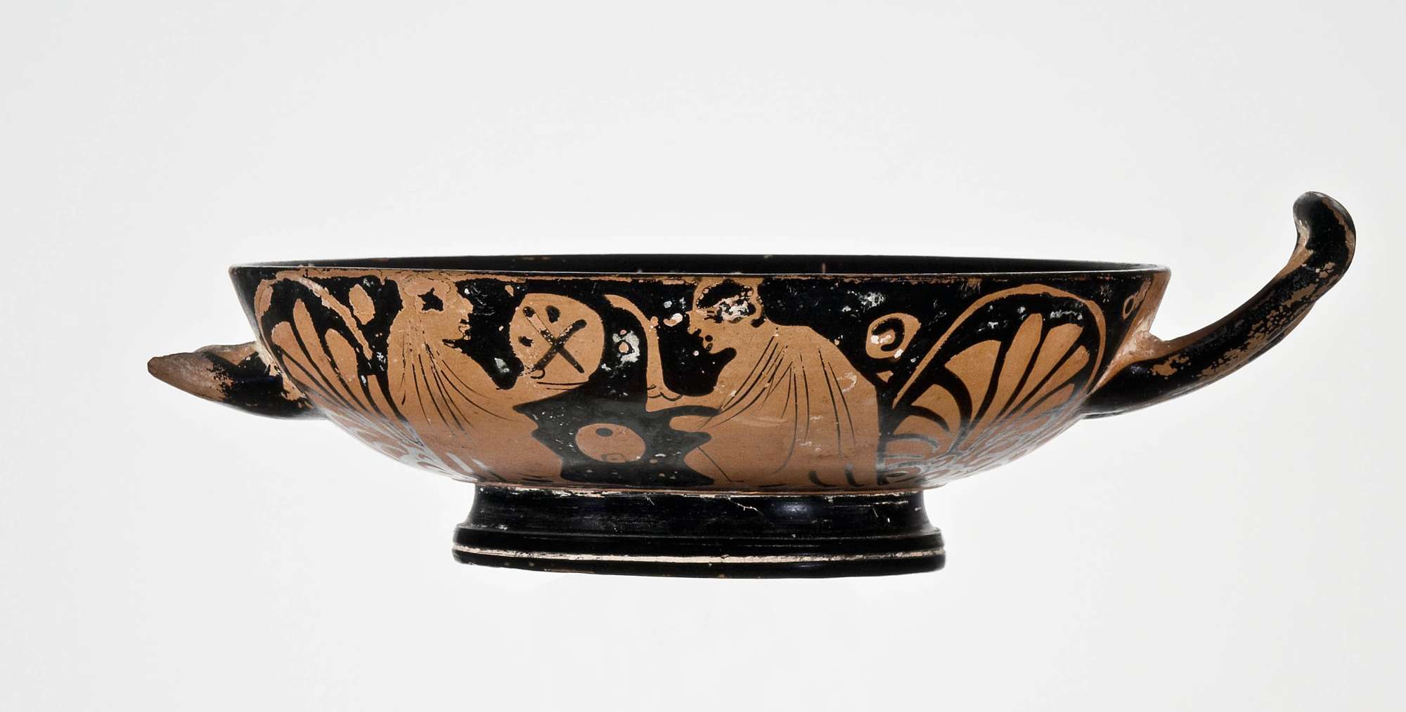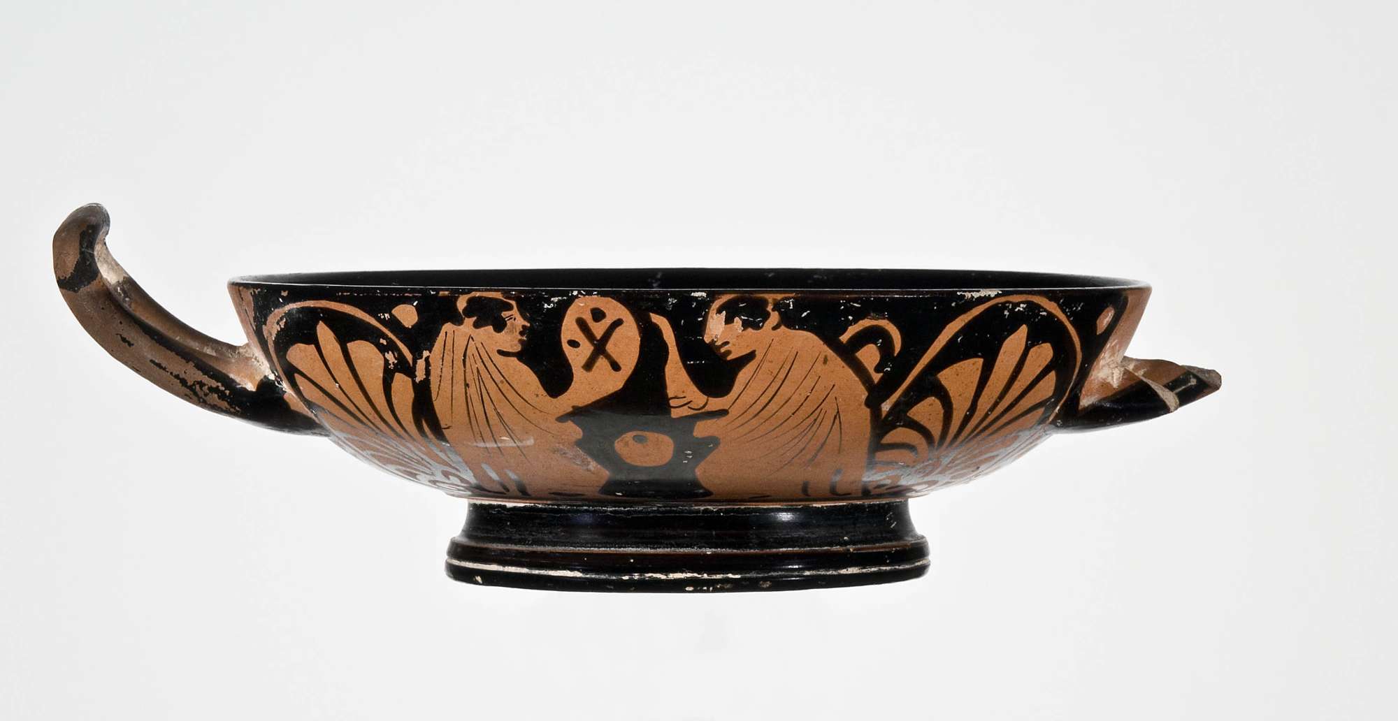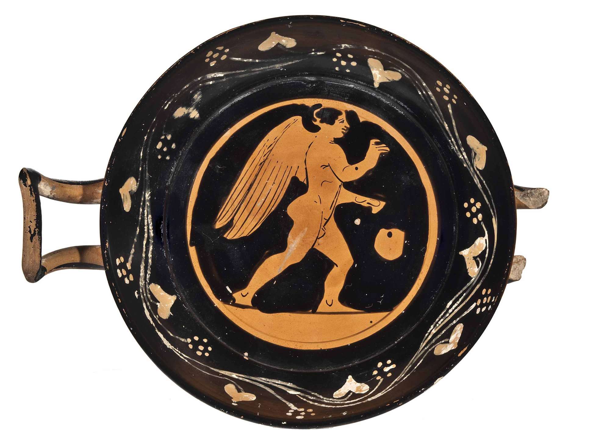 Coppa su stelo basso e largo attica a figure rosse. Lato A e B: due giovani con palla e strigile; interno: nel tondello Eros nudo in marcia con aryballos.