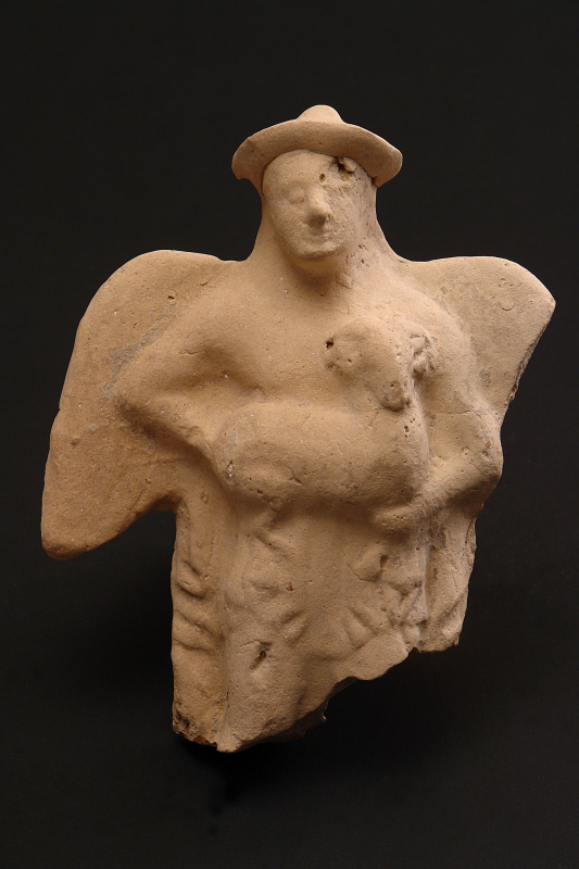Figura molto appiattita, maschile alata di prospetto che regge davanti al petto un piccolo ariete afferrandolo per le zampe anteriori e da tergo. Il volto è ovale, gli occhi e il naso sono sporgenti, la bocca piccola Indossa un mantello drappeggiato, forse sopra un corto chitone; e, lavorato a parte, un copricapo a punta, il petaso; fissate al dorso, un paio di ampie ali piatte.