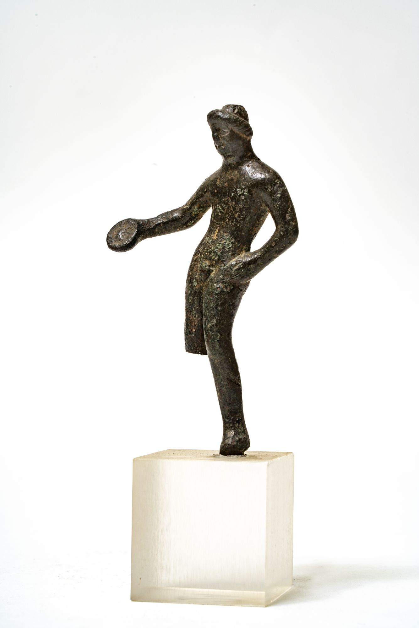 L'eroe ignudo, tende lateralmente una patera con la mano destra e tiene la sinistra appoggiata all'anca. Il ritmo fortemente sinuoso del busto, dall'anca destra sporgente, sbilancia la figura verso sinistra. Il volto rotondo, con le orbite infossate, è impostato su un collo massiccio e incorniciato da capelli a cercine segnati da brevi incisioni a raggiera. è privo di notazioni anatomiche.