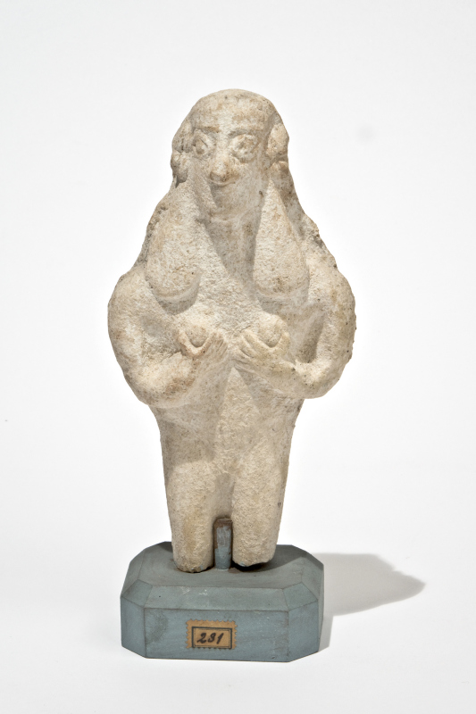 Idolo femminile rappresentante una donna in piedi con le mani sul petto, tipo della Venus Astarte. Ampia parrucca, occhi spalancati in rilievo, grande naso, orecchini a grappolo; corpo nudo con le mani al petto, retro piatto. Spezzata all'altezza delle ginocchia.