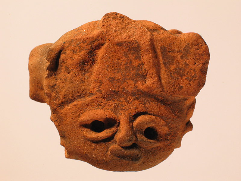 Piccolo sonaglio di stile Usulután in forma di testa umana, realizzato in terracotta ingobbiata. L’apertura sotto al collo rivela la presenza di una cavità all’interno che doveva essere riempita con pezzetti di terracotta o semi. I due fori sopra le orecchie, comunicando con l’interno cavo, agevolavano la propagazione del suono prodotto per scuotimento, probabilmente durante occasioni rituali. Il personaggio indossa un copricapo abbellito da due placche rettangolari e da nastri pendenti sulla fronte. Al centro è spezzata la consueta testina zoomorfa in rilievo.