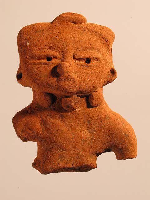 Figurina di argilla rossa di stile Usulután che rappresenta un uomo in posizione eretta. Il busto è spezzato all’altezza della vita. Manca il braccio destro e parte di quello sinistro. Il corpo della statuetta è pieno mentre la testa, cava all’interno, ospita dei pezzetti di argilla che dotano l’oggetto della funzione di sonaglio. A questo scopo sono stati praticati due fori laterali, appena sopra le orecchie, comunicanti con l’interno. Dalla vista di profilo è possibile apprezzare la posizione del volto, con il mento rivolto leggermente verso l’alto e soprattutto, la fronte piatta. Tale caratteristica rinvia probabilmente alle pratiche di deformazione cranica riservate agli individui di rango più elevato. La volontà di segnalare il prestigio è confermata anche dalla vistosa collana realizzata con tre applique sferiche sul collo, e dagli orecchini. Una fascia cinge la testa formando una sorta di turbante al centro del quale si nota, in rilievo, un elemento decorativo con una scanalatura centrale. Anche dietro la fascia del copricapo è in rilievo. Il torace è piatto. Tutta la figurina è stata ingobbiata e in parte levigata.
