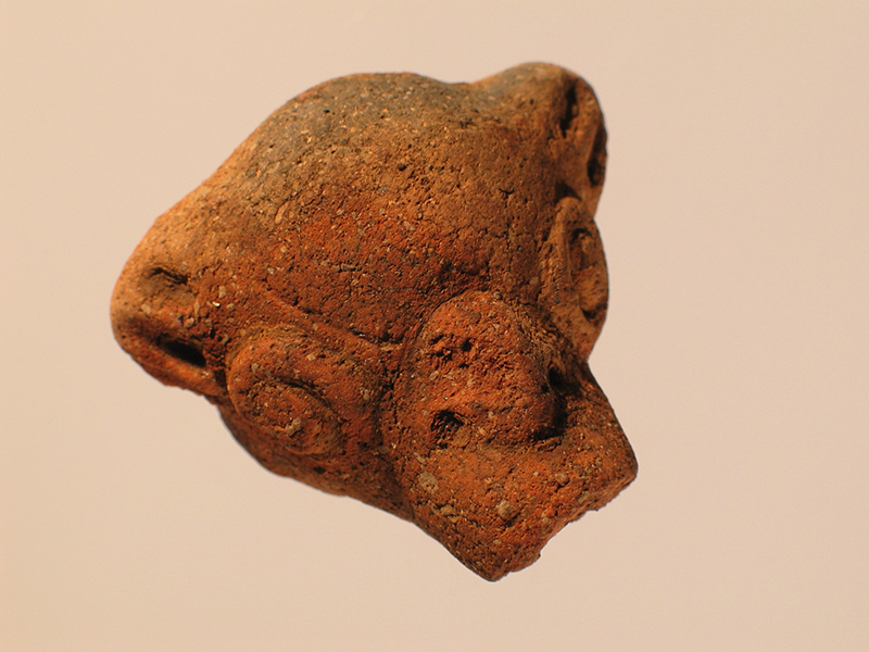 Testina di animale modellata in terracotta, di stile Usulután. L’interno è cavo, come si nota dal largo foro presente sotto al muso. La testa è rotonda con orecchie semicircolari in rilievo sulle quali sono visibili tre linee incise. Il muso è piuttosto allungato e ricorda quello di un formichiere o di un coatì. Dietro al collo si nota un accenno di presina ad anello che serviva per appendere l’oggetto. La superficie era stata ingobbiata. In alcune zone sono presenti delle bruciature.