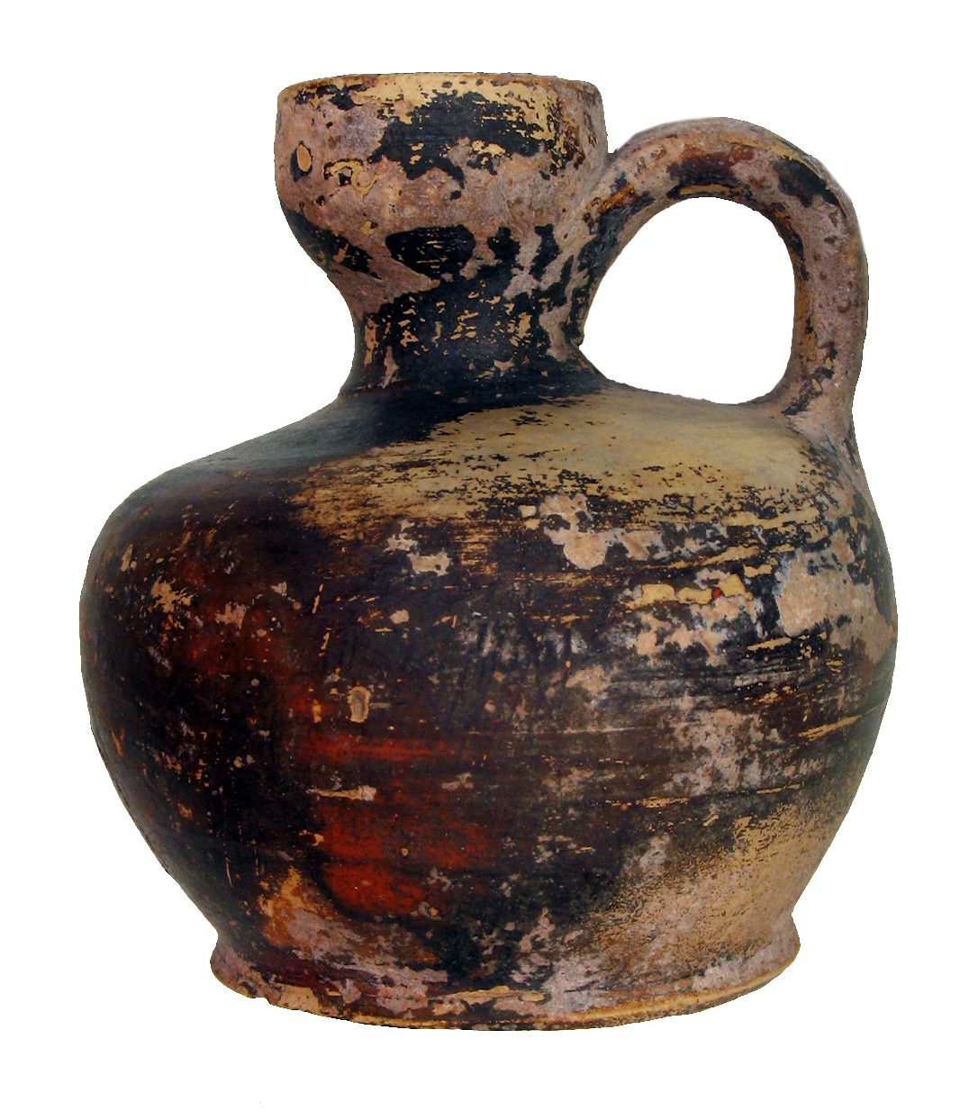 Olpe a corpo piriforme con piccola ansa anulare verticale.