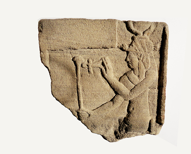 Frammento parietale in arenaria proveniente, come ricordato dal donatore Giuseppe de Pollo, dal complesso templare dell’isola di File: da un monumento architettonico a riquadri. Il pezzo ha forma rettangolare con lato sinistro regolare e parte superiore del lato destro rifiniti, mentre è inferiormente troncato in modo irregolare. Il rilievo presenta una figura femminile seduta verso sinistra, spezzata sulla linea del trono a bassa spalliera, con in capo le corna hathoriane poggiate sulle spoglie dell’avvoltoio. La lunga parrucca ricade sulla schiena.Tiene il braccio destro proteso in avanti, verso il basso, e stringe nella mano lo scettro di papiro; il braccio sinistro è flesso con la mano verticale aperta dal palmo rivolto in avanti a “offrire” il geroglifico sa (cioè “protezione”). Davanti ad essa doveva dunque esserci un’altra figura, probabilmente di un sovrano. Il fatto che, tuttavia, la zona di fronte al volto della dea sia rilevata rispetto al resto fa pensare che la lavorazione non sia stata terminata: è possibile che in quest’area si intendesse incidere il testo che identificava la divinità.