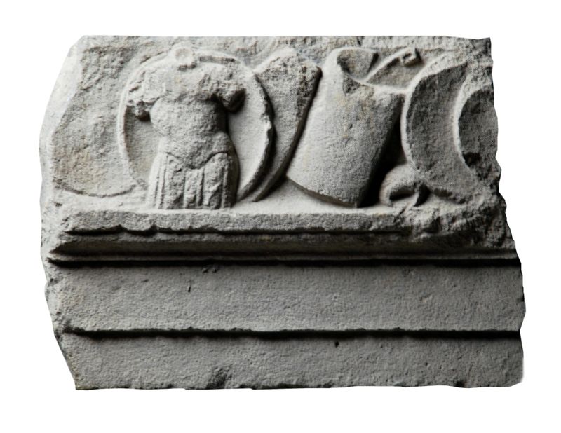 Sopra l’architrave, articolata in due fasce, una cornice con listello e gola rovescia, e un fregio d’armi a rilievo continuo. Da sinistra: un clipeus, visto internamente, con davanti una corazza anatomica con maniche a strisce di cuoio e una fila di pteryges terminanti a frangia; uno scudo rettangolare; uno scudo semicilindrico; un oggetto indefinibile (forse un drappeggio?) e due clipei sovrapposti. Contiguo a inv. 14369
