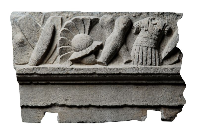 da sinistra: uno scudo rettangolare con umbone incrociato con uno scudo semicilindrico visto prospetticamente; una galea con grande, larga tesa e paragnatidi abbastanza sviluppate; due schinieri incrociati: una corazza di tipo ellenistico con spalline ed una fila di pteryges terminanti a frangia; uno scudo visto prospetticamente.
